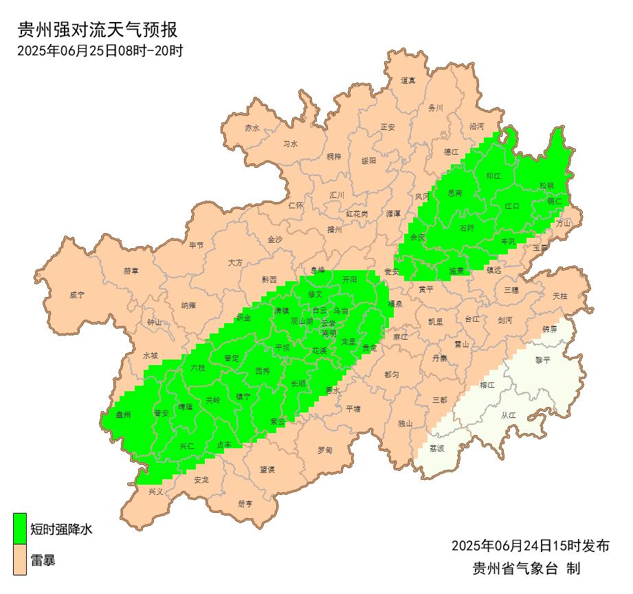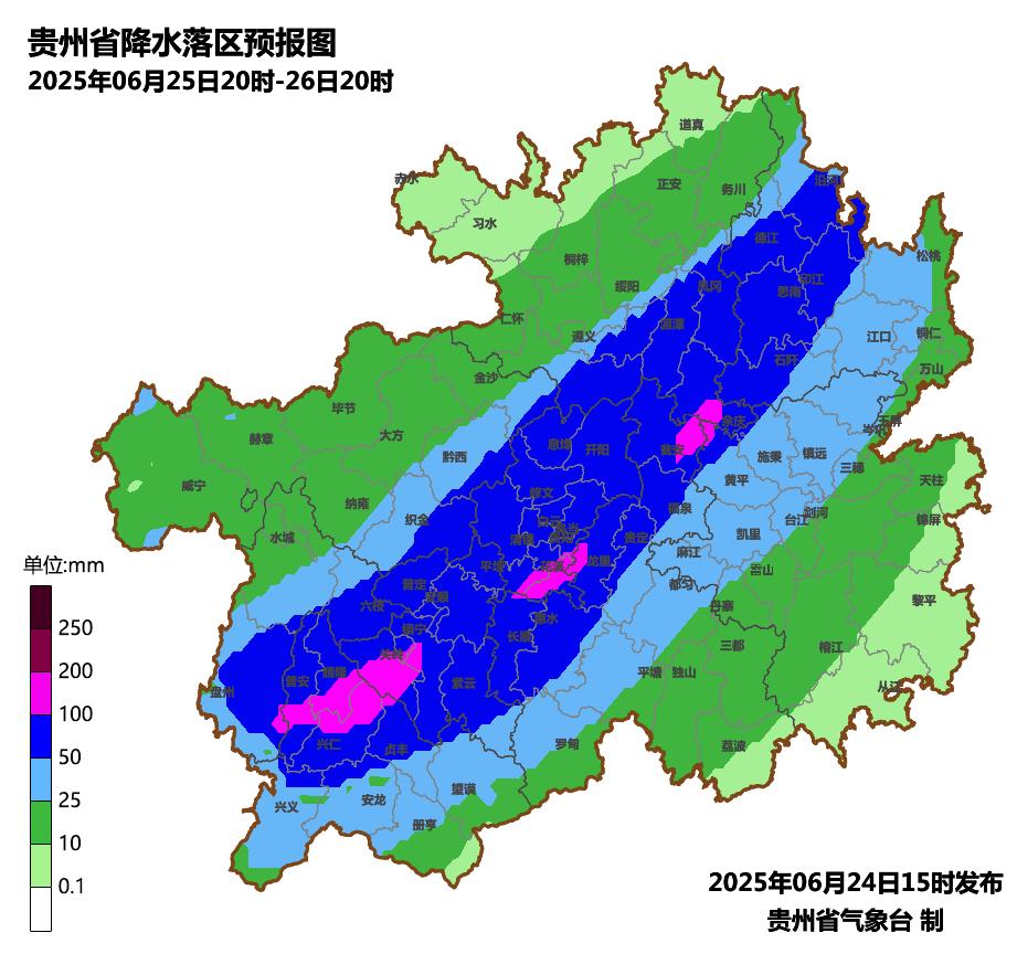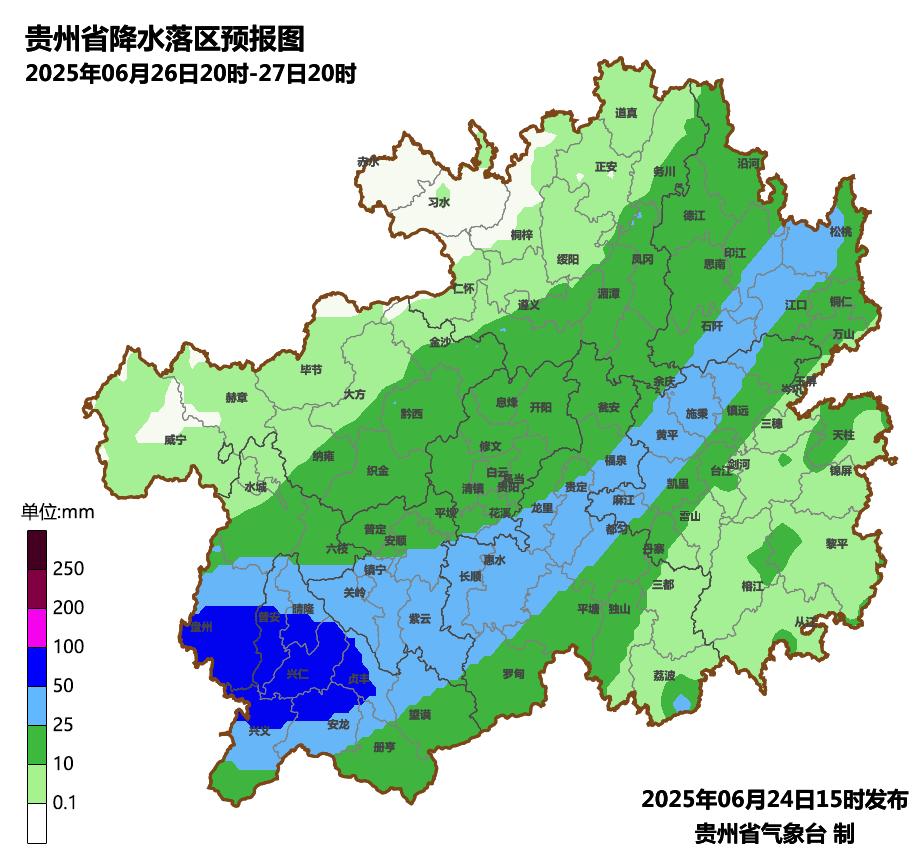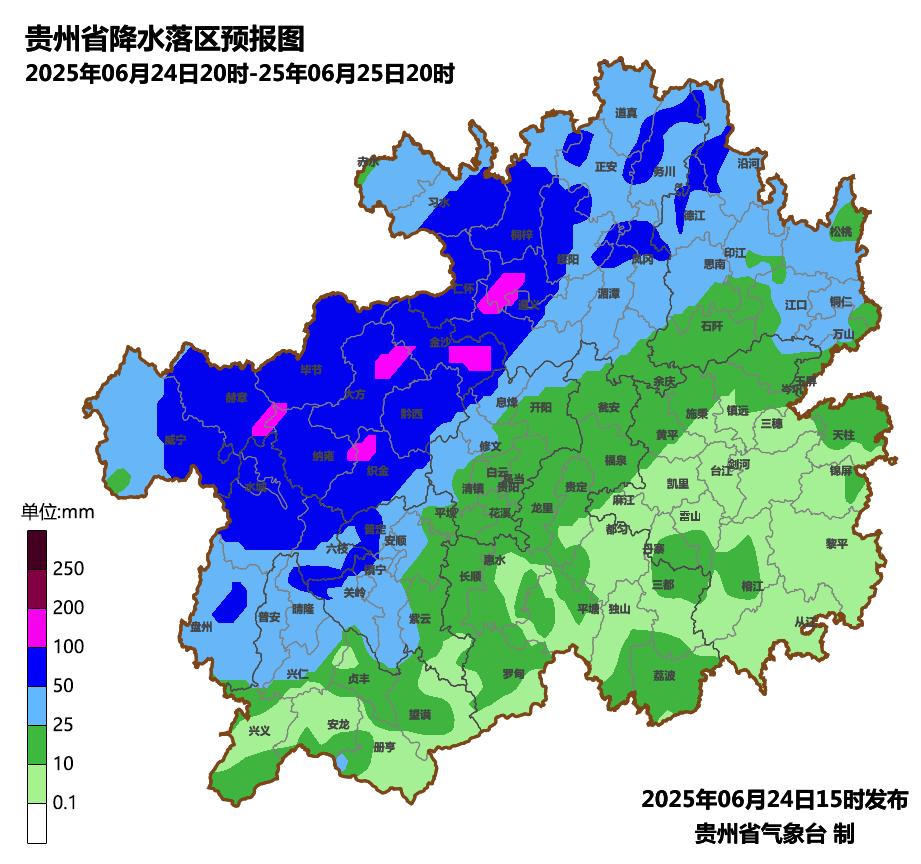 贵州省气象台6月24日12时发布暴雨蓝色预警。预计6月24日20时至25日20时,毕节市、六盘水市、遵义市大部(除余庆外的区县),安顺市西部及北部(关岭、普定、镇宁),贵阳市西部(修文、息烽、清镇),铜仁市北部(德江、沿河),黔西南州北部(晴隆)有大雨到暴雨,其中毕节市(七星关区、大方、纳雍、织金、赫章、金沙),遵义市(播州区、汇川区、红花岗区)等地区的部分乡镇将出现大暴雨。