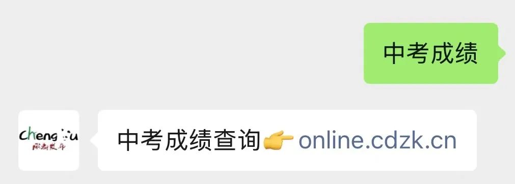 2、在“成都发布”微信公众号主页面回复关键词“中考成绩”,届时系统将自动回复“成都招考”链接;