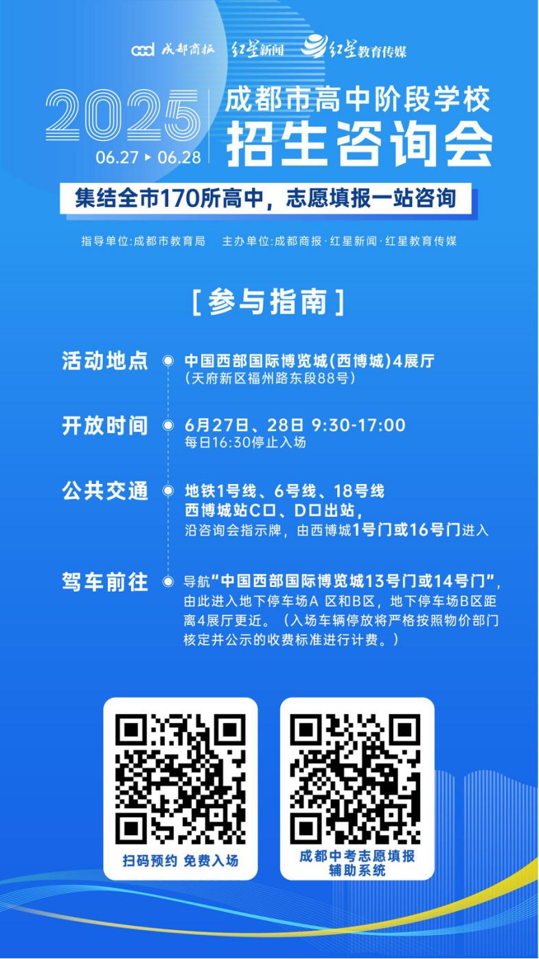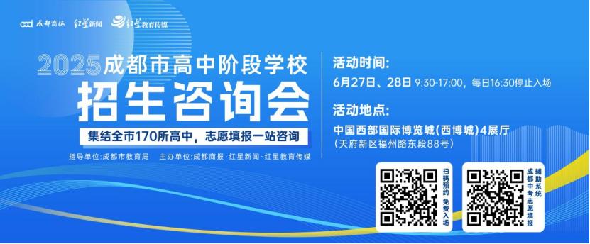 6月27日、28日9:30-17:00,由成都市教育局指导,成都商报·红星新闻·红星教育传媒主办的2025年成都市高中阶段学校招生咨询会,将在中国西部国际博览城(西博城)4展厅举行。