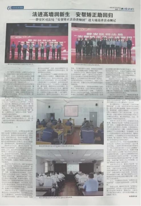《大墙内外》全版刊登静安区司法局“法治讲师团”法治宣讲活动静安区司法局“安帮矫正法治讲师团”自2023年年底成立以来,与市监狱管理局综治办、各监狱单位积极联动,坚持法治教育、加强教育矫正,以宣讲成效与法治教育需求相融合,力争实现“让安置帮教工作有温度,让教育矫正有深度,让普法教育深入人心”的目标。
