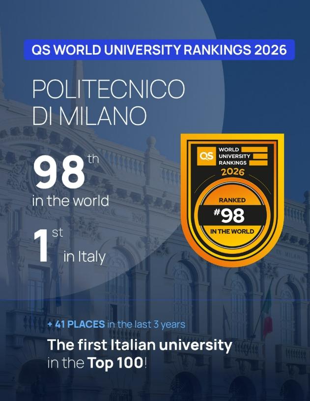 2025年6月19日,米兰理工大学在 2026 年 QS 世界大学排名中首次跻身全球前 100 名(第 98 位),成为目前意大利唯一进入该梯队的高校。