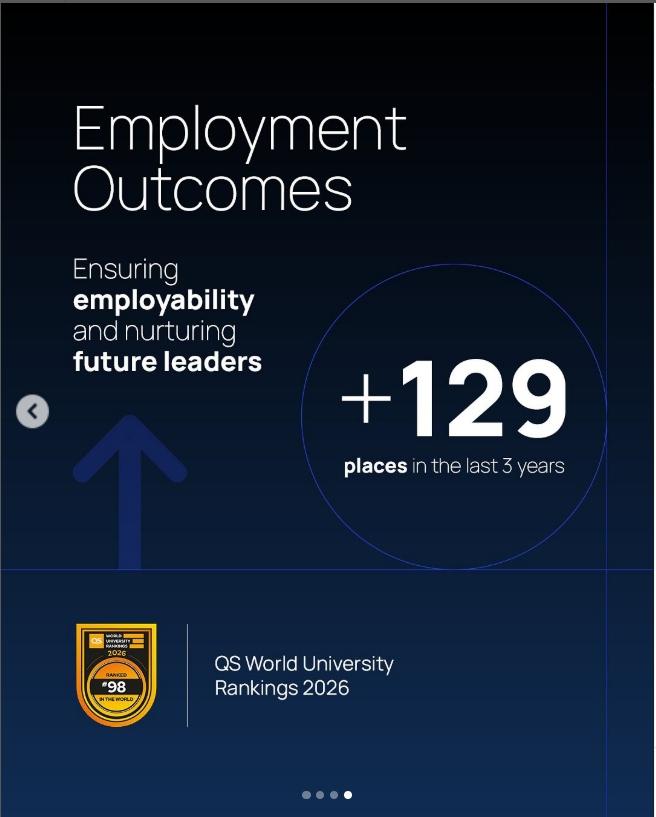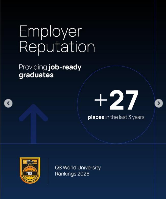 数据显示,33% 的硕士毕业生在毕业前已获得工作 offer,90% 的毕业生从事与专业相关的工作。这种 “就业导向” 的培养模式直接提升了 QS “就业成果” 指标(2026 年跃升 40 位至第 199 名)。