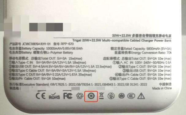 画圈处为充电宝上的电池可循环使用5年年限标识国家应急广播提醒