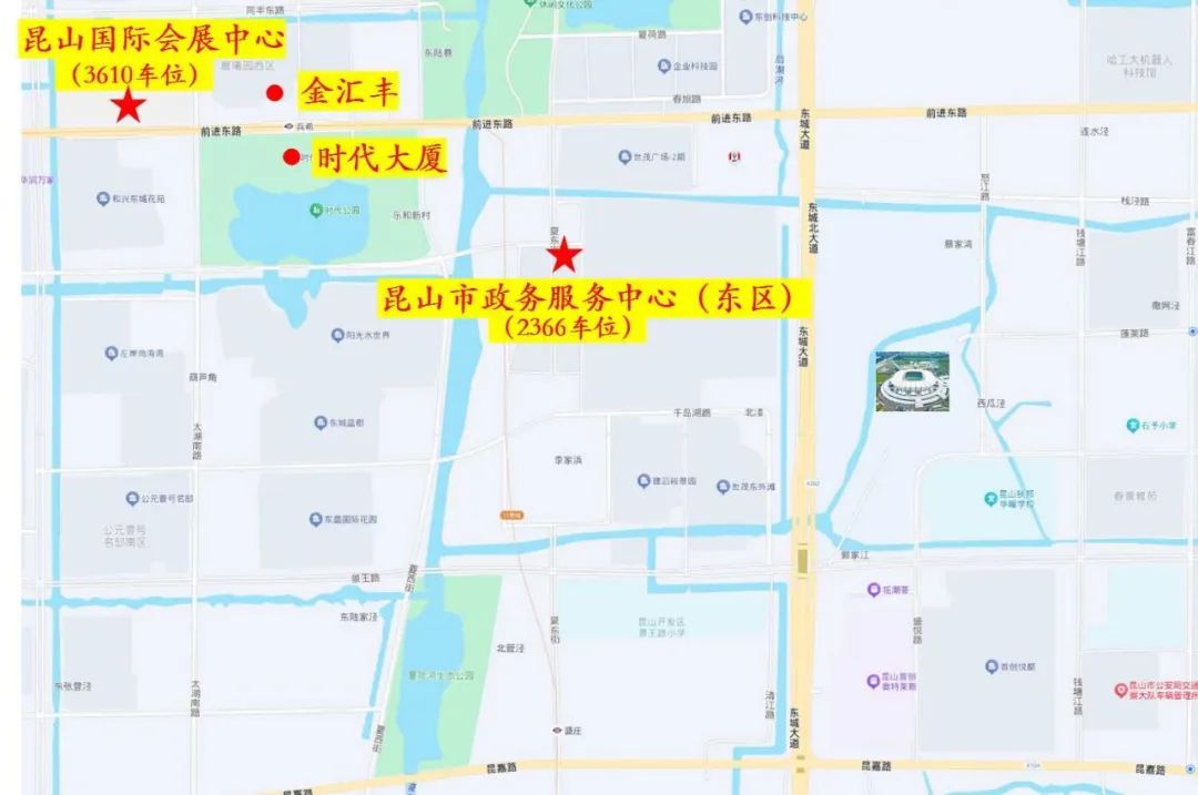 昆山国际会展中心、金汇丰、时代大厦(合计3610个车位)、昆山市政务服务中心(东区)停车场(2366个车位)【以上停车场配套免费公交专线】。