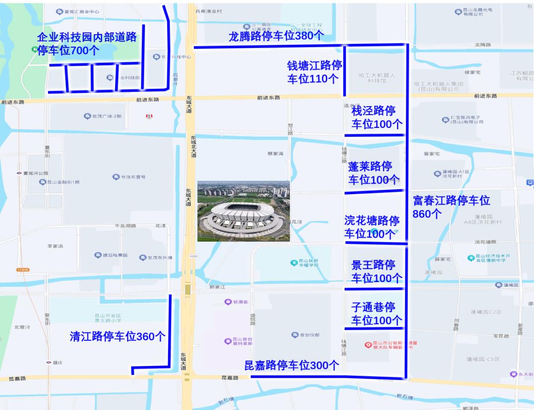 昆山奥体中心周边2km内共有10条路段和1个区域可供临时停车的车位3210个。龙腾路南北两侧(东城大道以东、380个车位)、钱塘江路(前进路以北、110个车位)、栈泾路南北两侧(钱塘江路-富春江路、100个车位)、蓬莱路南北两侧(钱塘江路-富春江路、100个车位)、景王路(钱塘江路-富春江路、100个车位)、子通巷南北两侧(100个车位)、昆嘉路南北两侧(盛悦路-富春江路、300个车位)、富春江路东西两侧(昆嘉路-龙腾路、860个车位)、清江路(景王路-昆嘉路、360个车位)、浣花塘路南北两侧(钱塘江路-富春江路、100个车位)以及企业科技园内部道路(700个车位)。