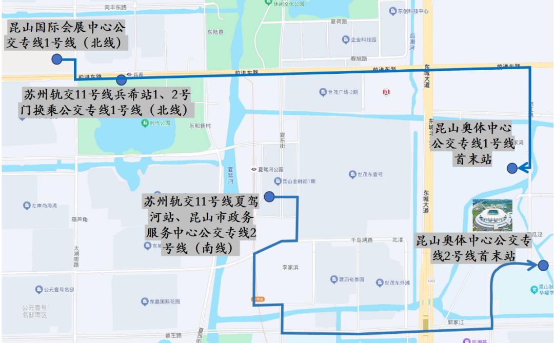 2.可乘坐苏州地铁11号线至夏驾河地铁站(8号口),换乘免费公交专线2号线(南线)至奥体中心。