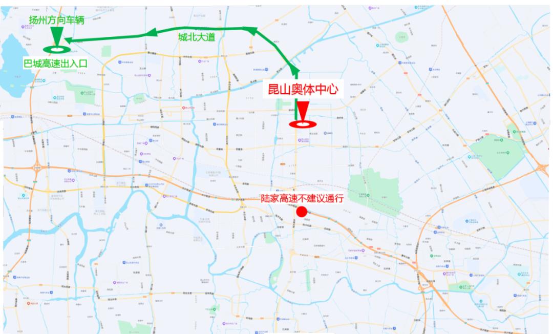 前往扬州方向:请向北从城北大道绕行至常嘉高速巴城收费站。