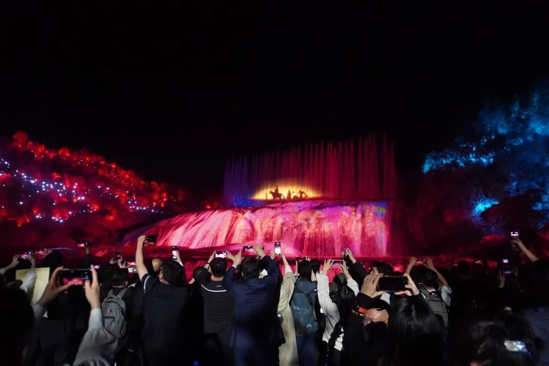 《再回西游》项目是黄果树景区基于经典传统文化和独特自然景观打造的沉浸式夜游体验。以 86 版《西游记》经典取景地陡坡塘瀑布为核心舞台,选取《西游记》中 “三打白骨精”“女儿国奇遇”“五圣成真” 等篇章,通过角色扮演、融合机械装置、强调近触的观演形式,运用 3D 裸眼全息影像、AI 建模以及智能交互等前沿技术,打破传统观演模式,以山水为幕,以光为笔,再现经典场面。