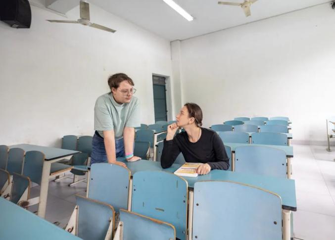 6月24日,莎河娜斯(右)请同学辅导考研面试