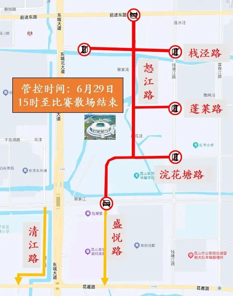 管控路口:东城大道洪湖路、东城大道昆嘉路、东城大道景王路路口临时实施交通管控,机动车请勿沿辅道向南行驶。