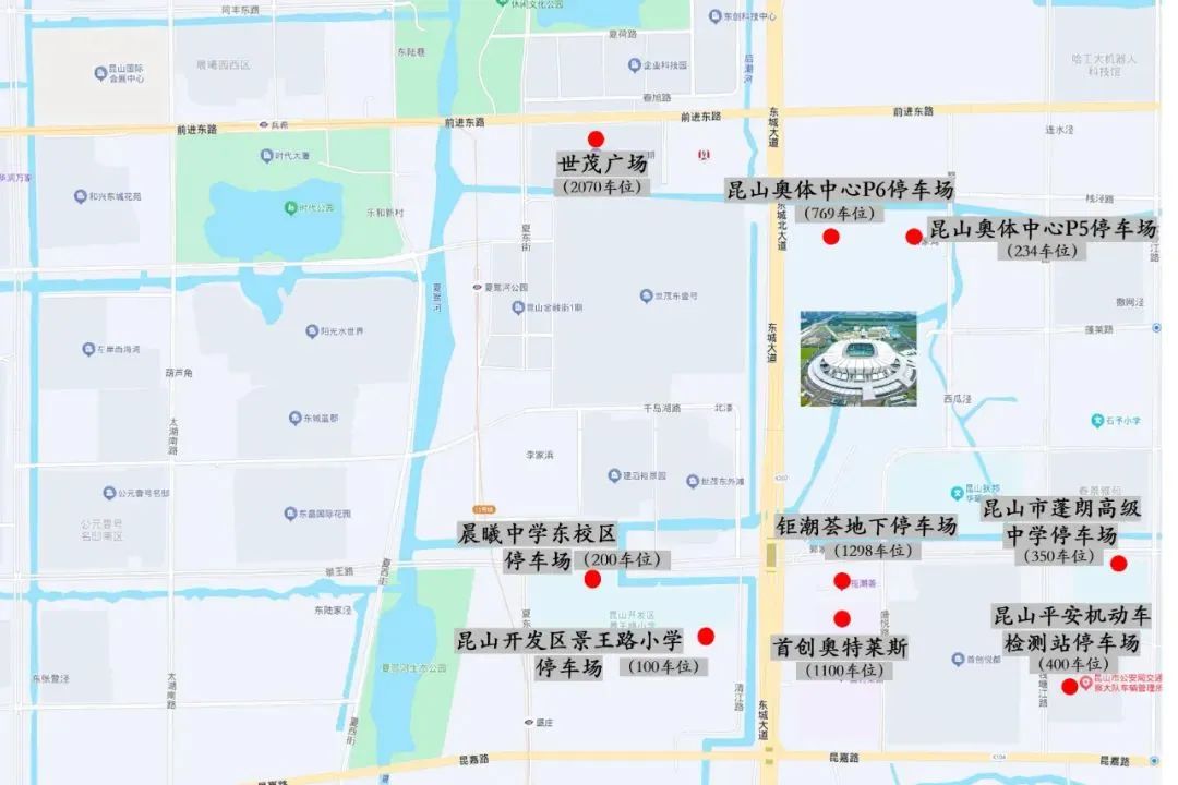 世茂广场停车场(2070个车位)、奥体中心P5停车场(234个车位)、奥体中心P6停车场(769个车位)、钜潮荟停车场(1298个车位)、首创奥特莱斯停车场(1100个车位)、晨曦中学东校区停车场(200个车位)、蓬朗高级中学停车场(350个车位)、昆山开发区景王路小学停车场(100个车位)、平安机动车检测站停车场(400个车位)。