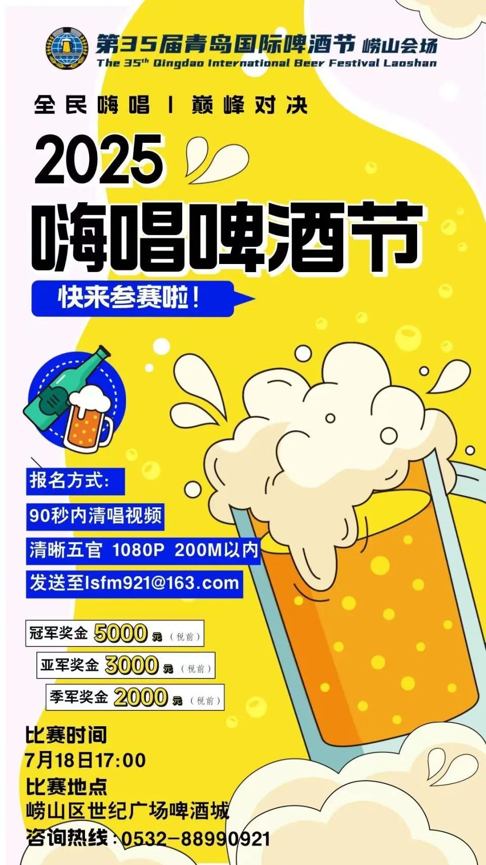 青岛国际啤酒节邀您以歌会友!第35届青岛国际啤酒节重磅打造的全民音乐盛宴——“嗨唱啤酒节”活动已正式启动。无论年龄、国籍,无论个人献唱还是乐队、家庭组合登场,只要热爱歌唱,这里就是你的舞台!