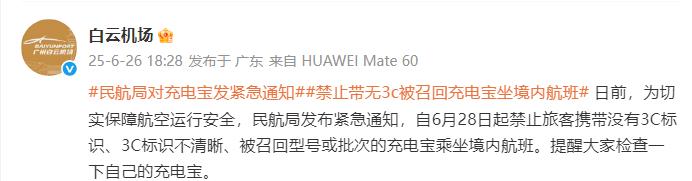 26日,有记者电话咨询多个机场:成都天府国际机场工作人员均表示,自6月28日0时起执行上述规定。乌鲁木齐天山国际机场工作人员则表示,自27日6时许开始执行该规定,禁止携带被召回型号或批次的充电宝,相关信息可上网查询。