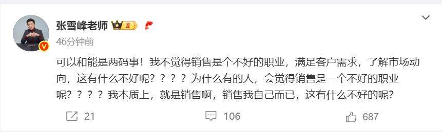 来源 | 综合九派新闻、当事人账号原标题:《张雪峰称大多数文科生不考公就是做销售,“我自己就是销售,没什么不好的”》