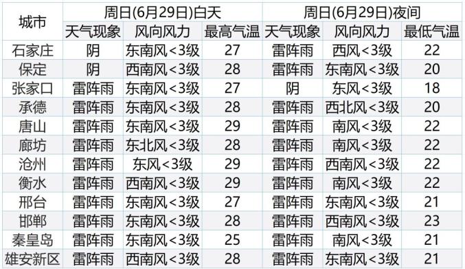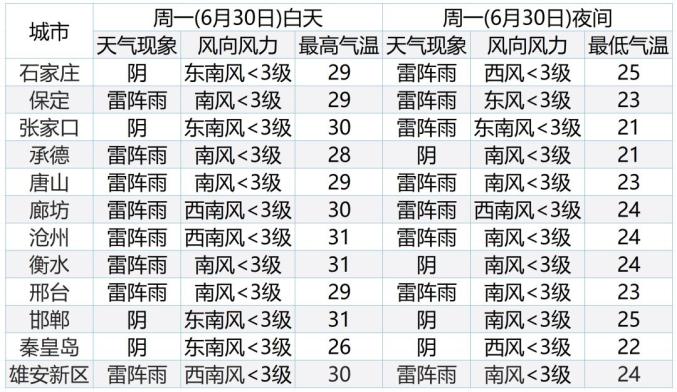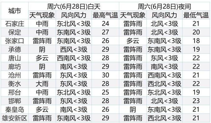 明天白天到夜间,全省阴,大部分地区有雷阵雨或阵雨,其中张家口、承德南部、唐山、沧州、衡水东部、邯郸东部部分地区有中到大雨。
