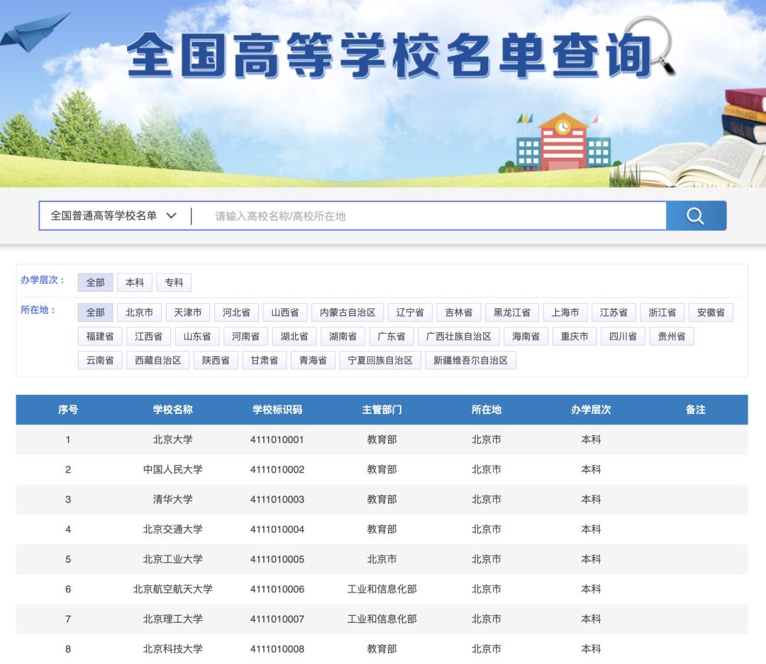 最新!全国高等学校名单