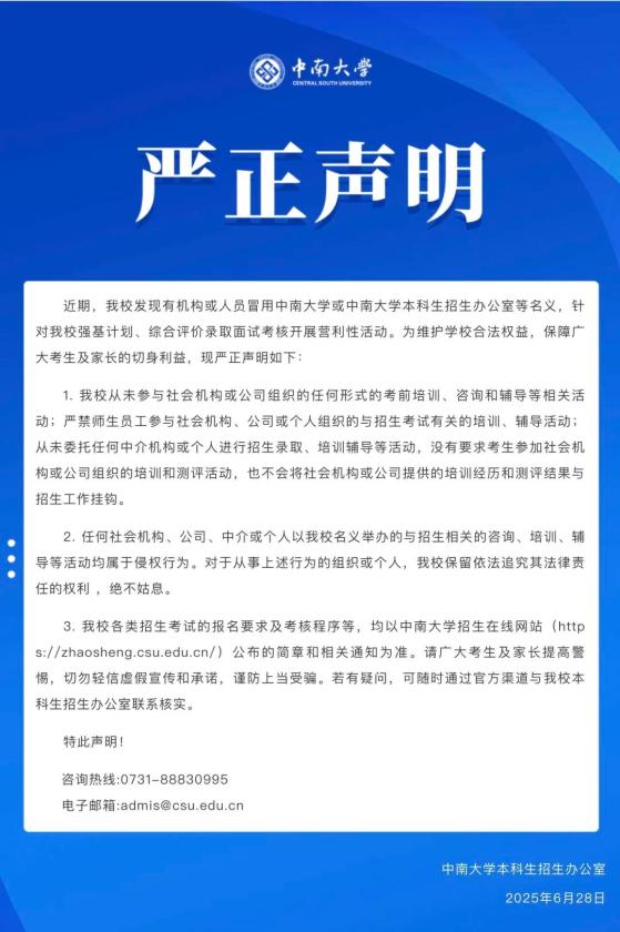 6月28日下午,中南大学本科招生办公室在中南大学微信公众号发布严正声明: