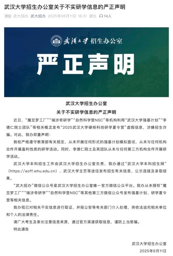 武汉大学招生办公室发布声明称,有机构利用“武汉大学强基计划”“李德仁院士团队”等相关概念,发布“2025武汉大学硬核科技研学夏令营”的虚假信息,涉嫌招生诈骗。武汉大学严格遵守教育部有关规定,从未开展任何形式的强基计划模拟面试,也从未与任何机构合作开展营利性质的研学活动。目前,武汉大学招生办公室已对相关不实信息进行取证,并报公安等有关部门介入处理,将依法追究相关单位和个人的法律责任。