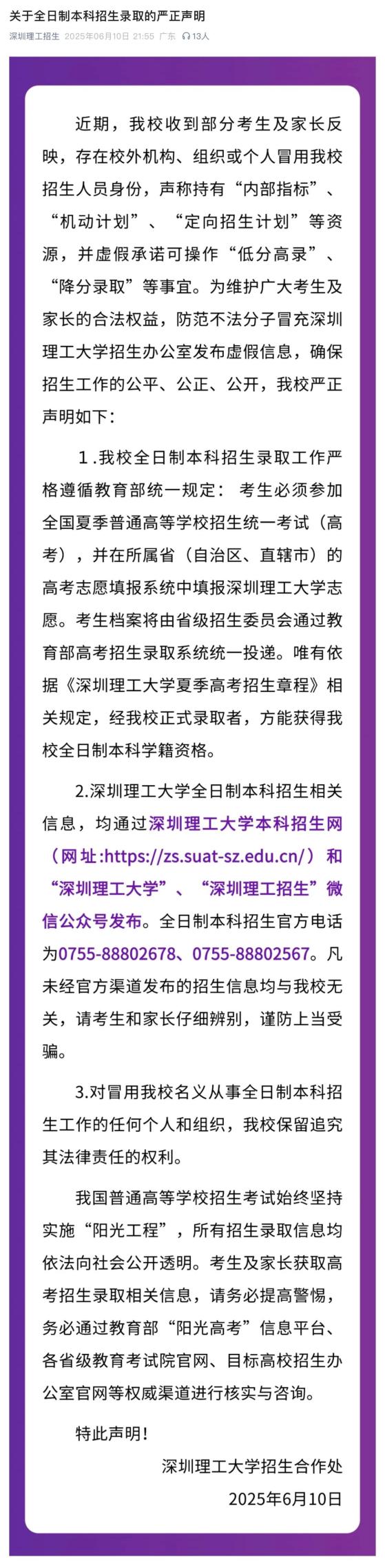 深圳理工大学招生合作处发布严正声明,有校外机构、组织或个人冒用深圳理工大学招生人员身份,声称持有“内部指标”“机动计划”“定向招生计划”等资源,并虚假承诺可操作“低分高录”“降分录取”等事宜。深圳理工大学全日制本科招生录取工作严格遵循教育部统一规定,考生必须参加全国高考并填报深圳理工大学志愿,档案由省级招生委员会通过教育部高考招生录取系统统一投递。唯有依据《深圳理工大学夏季高考招生章程》相关规定,经正式录取者,方能获得全日制本科学籍资格。