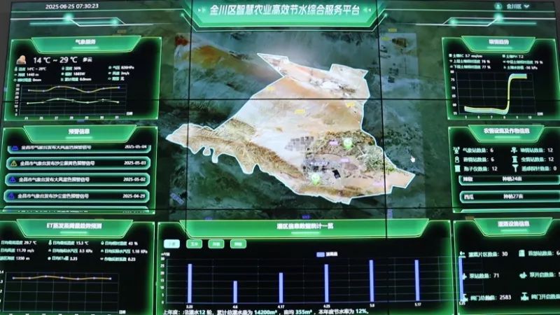 走进金川区智慧农业指挥中心,巨大的屏幕上,土壤含水量、作物蒸腾量、未来降雨预测等数据如溪流般跳动。“传统灌溉全凭经验,看叶子卷了才知道缺水,其实已经晚了!”韩程鹏指着屏幕说,“现在靠数据说话,系统整合了甘肃省农科院在石羊河流域积累的多年研究成果,针对小麦、玉米等6类主栽作物,建立了包含200多项参数的生长模型数据库。它能提前‘诊断’墒情,精准判断‘何时浇、浇多少’,决策准确率高达92%。”