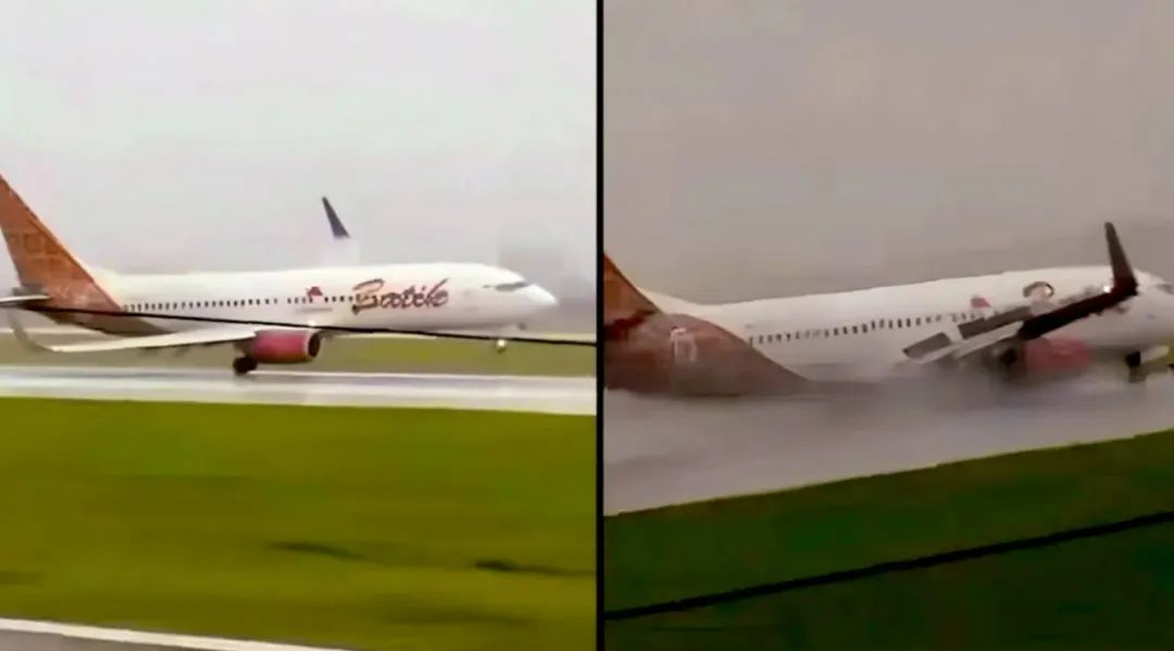 当时,巴迪航空这架飞机遭遇强烈侧风与暴雨袭击,在最后进近阶段机身剧烈倾斜,右翼急剧下坠,发动机险些擦撞跑道。所幸机组凭借敏锐直觉与沉着操作及时稳住飞机,避免了一场可能发生的严重事故。