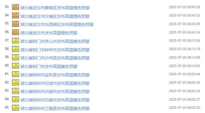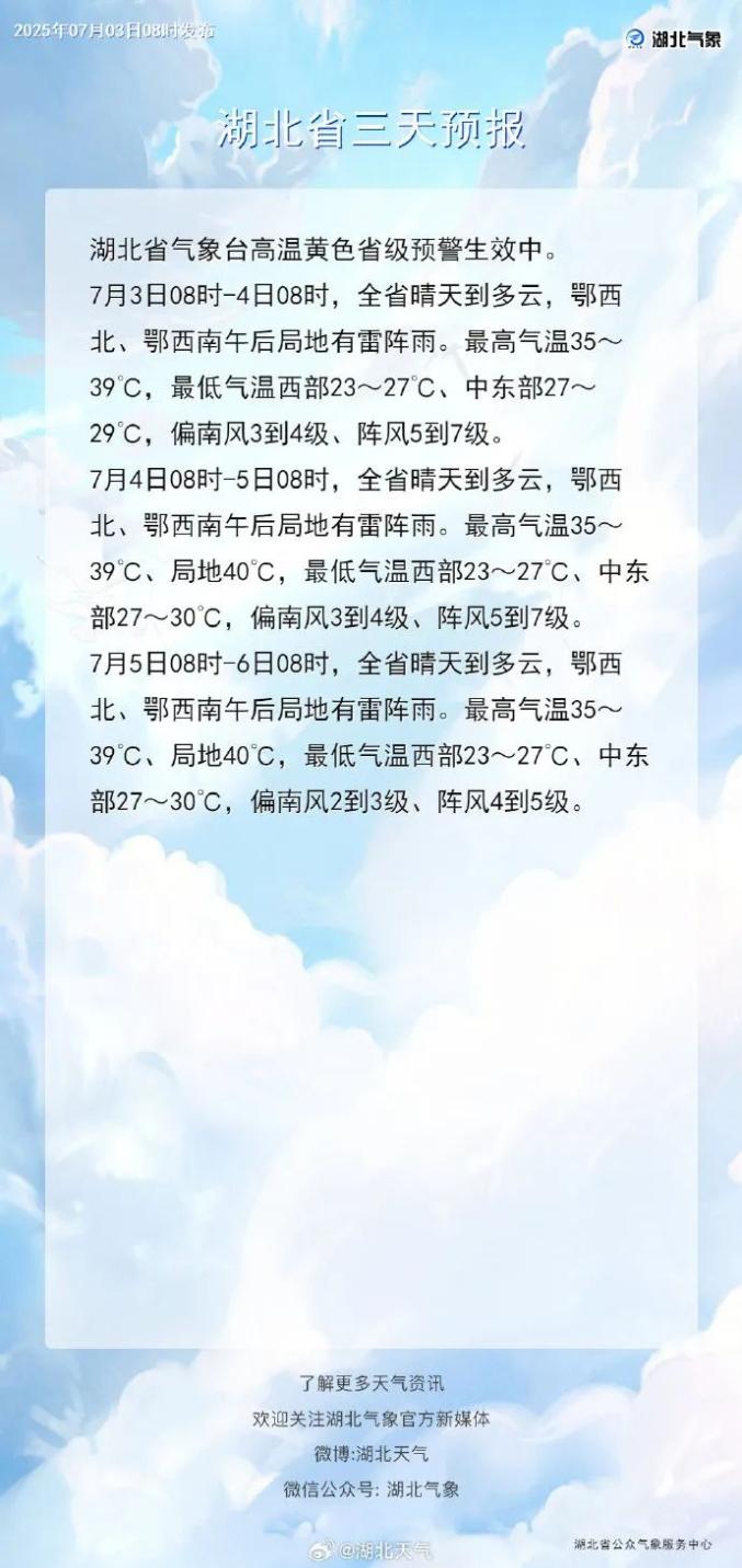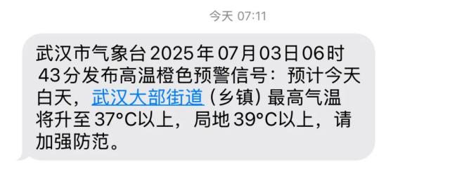 武汉市气象台2025年07月03日06时43分发布高温橙色预警信号:预计今天白天,武汉大部街道(乡镇)最高气温将升至37℃以上,局地39℃以上,请加强防范。