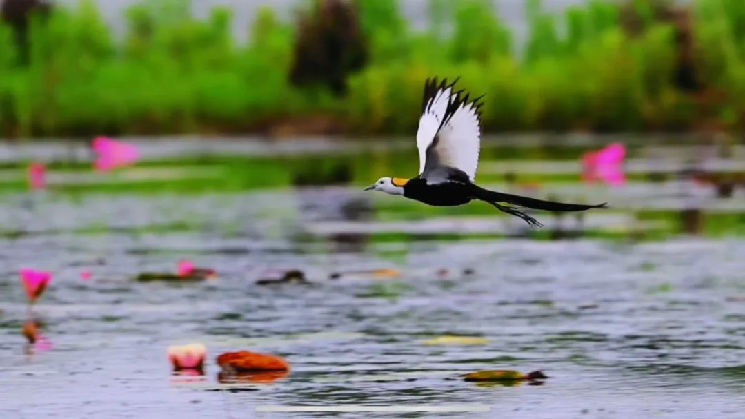 “水质优良、环境好的地方才可能出现水雉。这里水域开阔,荷花、睡莲等水生植物茂盛,生机盎然,为水雉提供了完美的栖息环境。我们蹲守多天,终于记录到了它们美丽优雅的身影。”生态摄影爱好者龚健康表示。