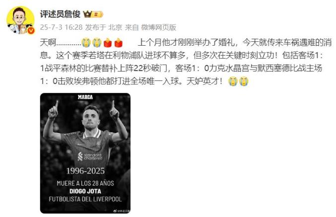 知名体育评论员同时也是利物浦球迷的詹俊在个人社媒发文悼念:上个月他才刚刚举办了婚礼,今天就传来车祸遇难的消息。这个赛季若塔在利物浦队进球不算多,但多次在关键时刻立功!包括客场1:1战平森林的比赛替补上阵22秒破门,客场1:0力克水晶宫与默西塞德比战主场1:0击败埃弗顿他都打进全场唯一入球。天妒英才!