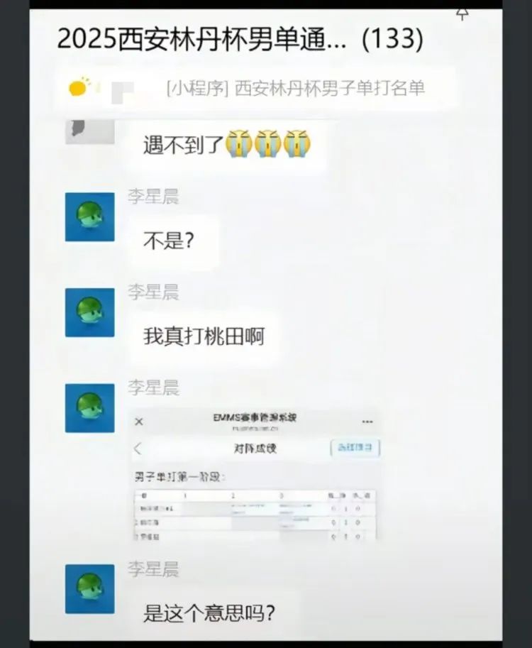 抽签结果出炉后,李星晨在赛事群表达震惊。网络图