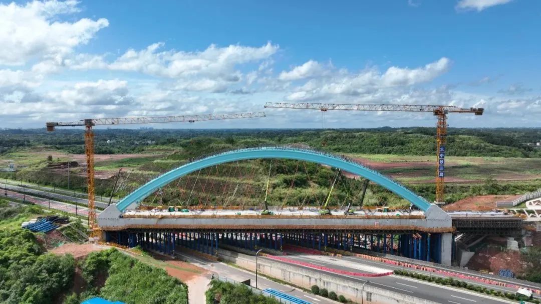近日,成渝中线高铁四川段首个大跨度系杆拱——跨成龙简快速路特大桥128米系杆拱桥顺利完成。