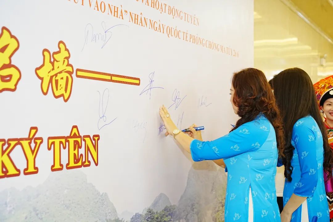 双方代表共唱中越友谊之歌,在禁毒承诺墙上签名,为现场观众发放禁毒宣传资料,营造出人人抵制毒品、人人参与禁毒的良好氛围。