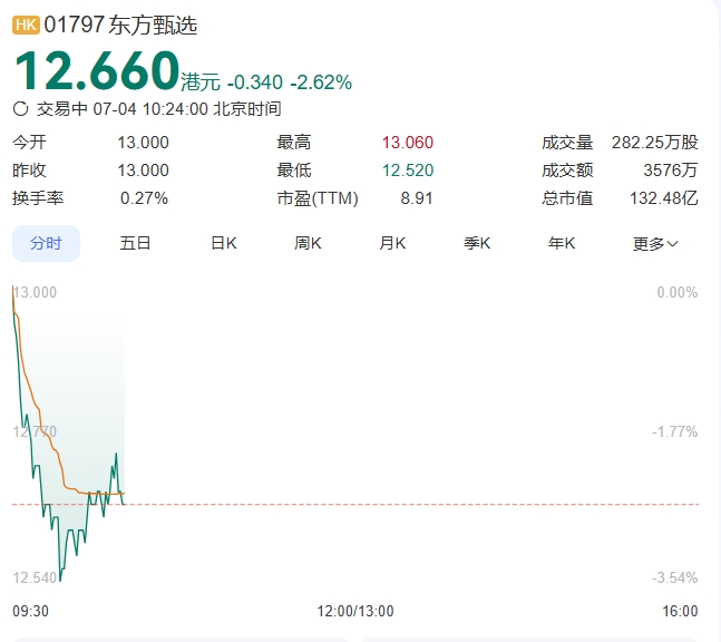 截至7月4日10时24分,东方甄选股价为12.66港元/股,跌幅为0.34%,总市值为132.48亿港元。