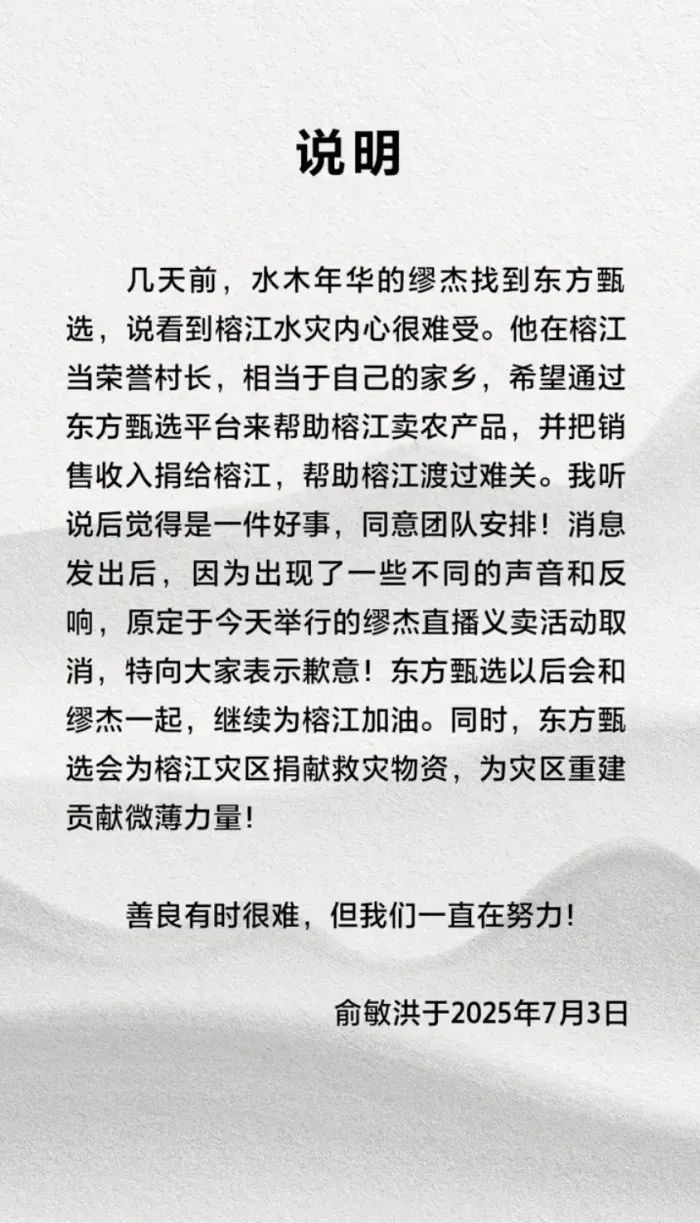 声明中,俞敏洪表示:“几天前,水木年华的缪杰找到东方甄选,说看到榕江水灾内心很难受。他在榕江当荣誉村长,相当于自己的家乡,希望通过东方甄选平台来帮助榕江卖农产品,并把销售收入捐给榕江,帮助榕江渡过难关。我听说后觉得是一件好事,同意团队安排!消息发出后,因为出现了一些不同的声音和反响,原定于今天举行的缪杰直播义卖活动取消,特向大家表示歉意!东方甄选以后会和缪杰一起,继续为榕江加油。同时,东方甄选会为榕江灾区捐献救灾物资,为灾区重建贡献微薄力量!善良有时很难,但我们一直在努力!”