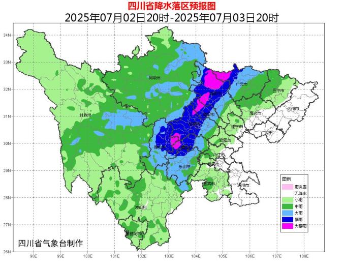 四川省气象台7月2日15时35分发布暴雨蓝色预警: 7月2日20时到3日20时:广元、绵阳、德阳、成都、雅安、眉山、乐山7市的部分地方有暴雨(雨量50~90毫米),局部大暴雨,最大累计雨量180~220毫米,最大小时雨强70~90毫米,局部伴有短时雷雨大风。另外,川西高原东部部分地方有大雨到暴雨(雨量25~60毫米)。