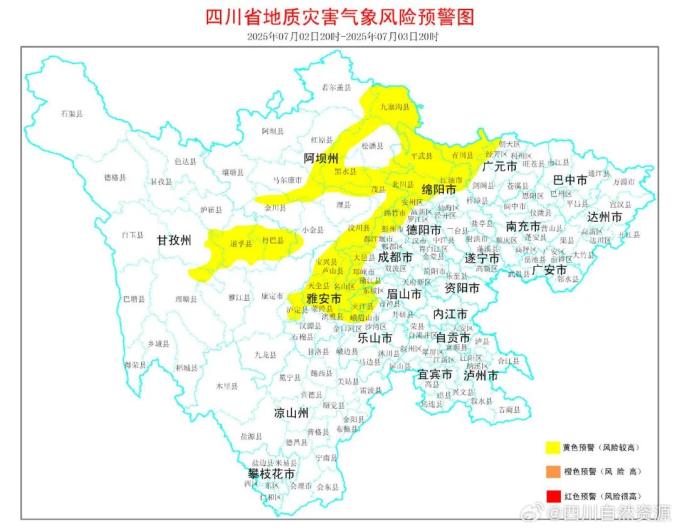 根据四川省气象台天气预报情况,结合四川省地质环境条件,7月2日20时至7月3日20时,全省地质灾害气象风险预警结果如下: