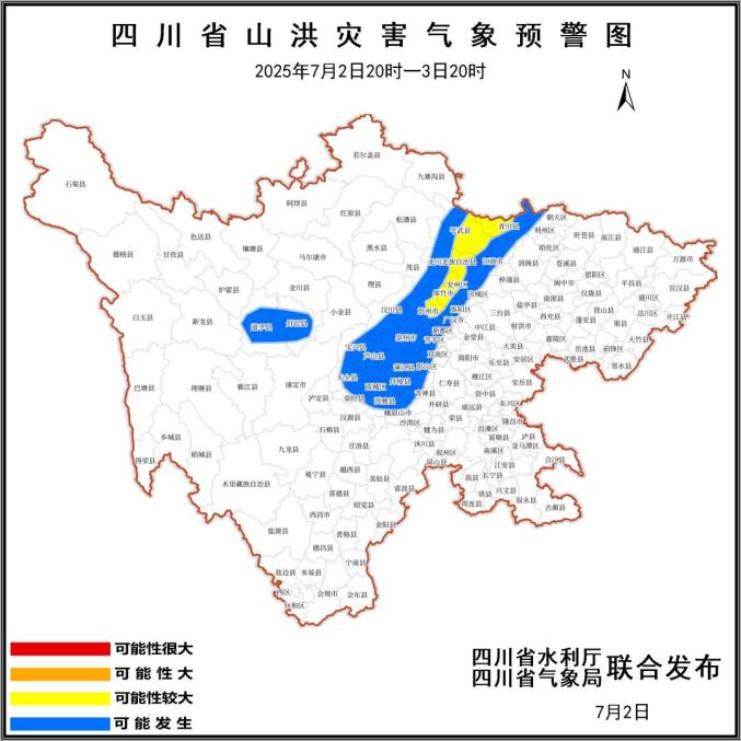 2025年7月2日20时至3日20时,绵阳市安州、平武、北川,德阳市绵竹、什邡,成都市彭州,广元市青川等7个县(市、区)发生山洪灾害可能性较大(黄色);