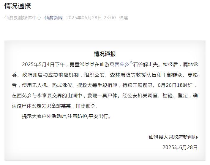5月4日,一名8岁男童随父母到福建省莆田市仙游县石谷解登山,下山时与父母失联。各方持续开展搜寻,事件引发广泛关注。6月28日晚,福建省莆田市仙游县人民政府新闻办发布情况通报,确认该男童已遇难。据悉,石谷解海拔1803.3米,是闽中第一高峰,也是未开发的野山。