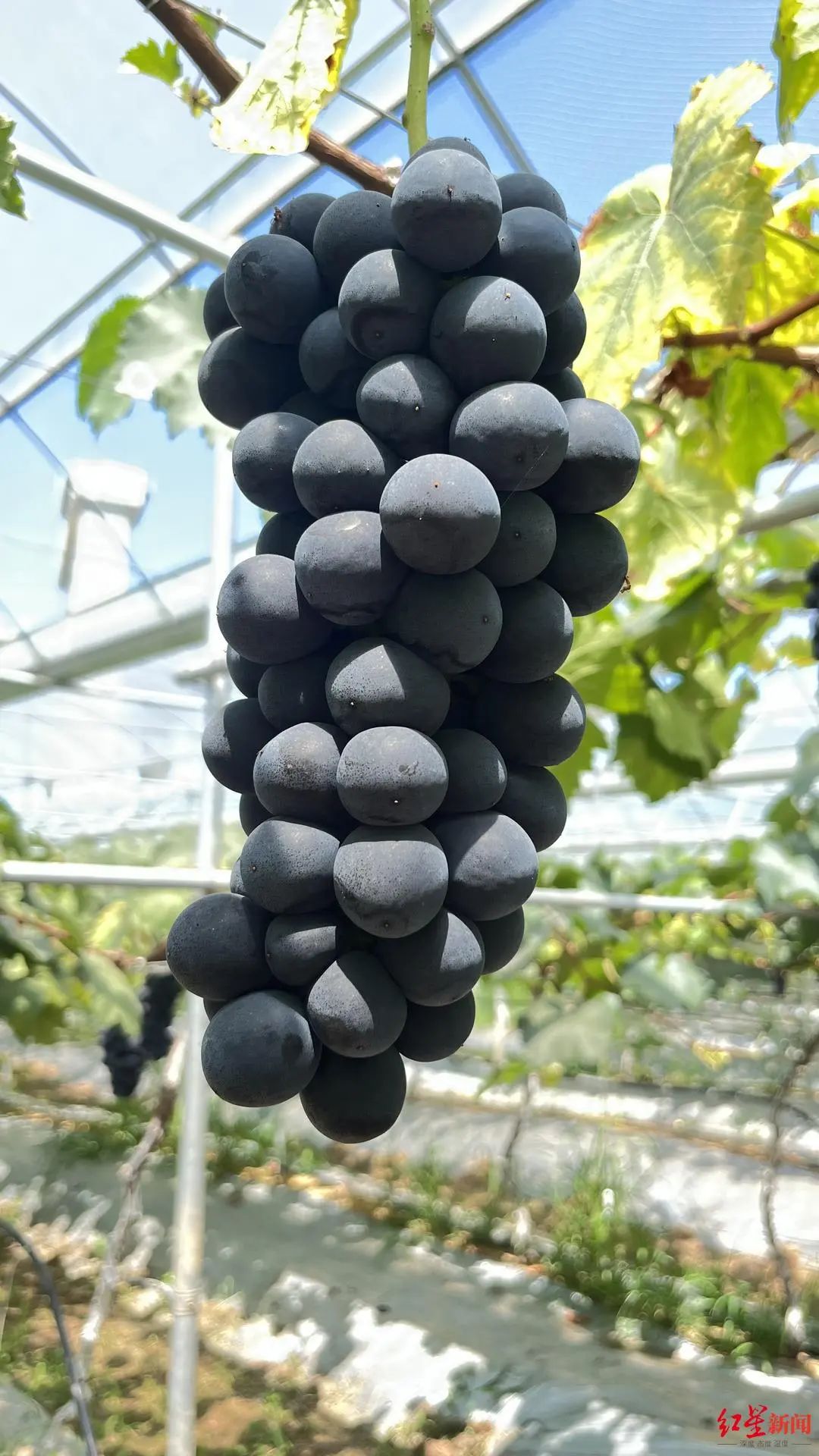 在推广会上听完众专家介绍后,种植户陈泉武跟随一众专家来到了葡萄种植基地。上午11时许,在四川天府新区葡萄种植示范基地内,陈泉武被一串红里透着黑的葡萄所吸引。清晨的露水凝聚在紫宝石一样的葡萄上,稍微凑近,仿佛能闻到淡淡的玫瑰花香。