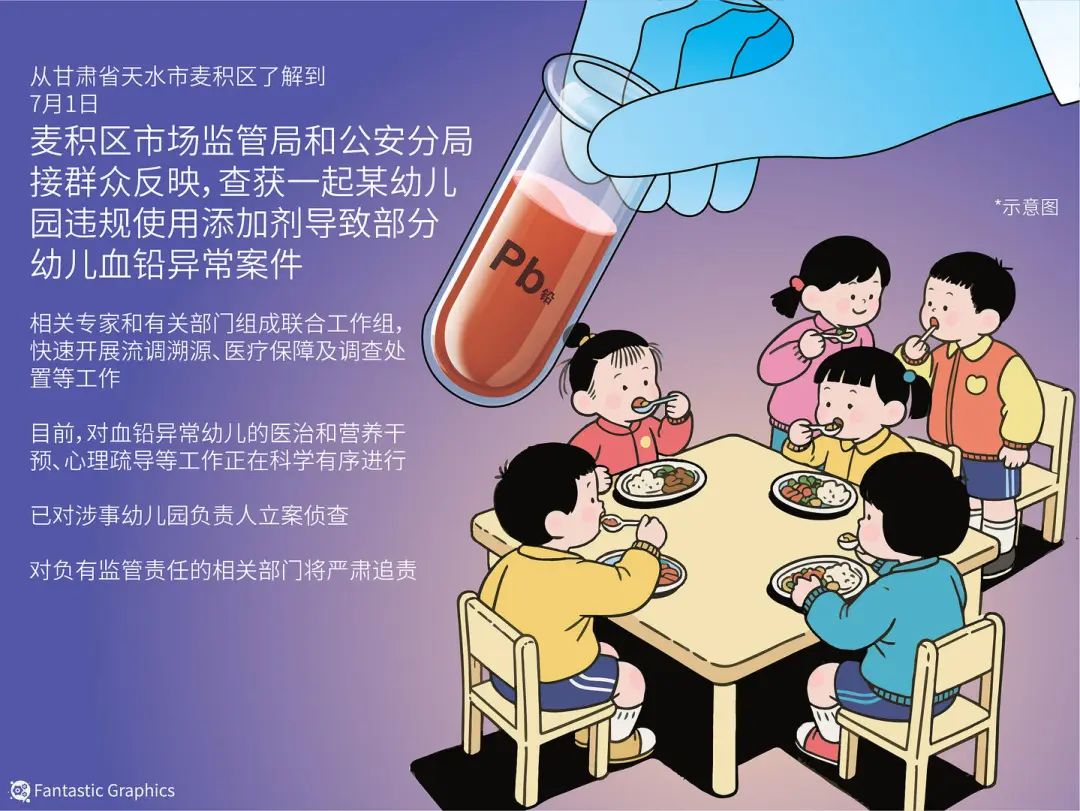 据天水市麦积区官方通报,2025年7月1日,麦积区市场监管局和公安分局接群众反映,查获一起某幼儿园违规使用添加剂导致部分幼儿血铅异常案件。目前,对血铅异常幼儿的医治和营养干预、心理疏导等工作正在科学有序进行。已对涉事幼儿园负责人立案侦查。对负有监管责任的相关部门将严肃追责。其他相关调查工作正在有序进行。