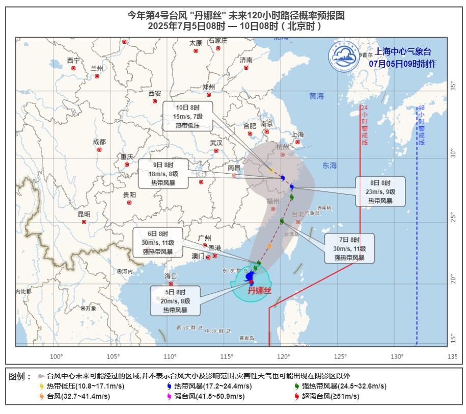 今明登顶“炎”值巅峰,远在海上的台风“丹娜丝”会为申城天气带来什么变数?南海热带低压已于今天(5日)凌晨2点在南海东北部海面上加强为今年第4号台风“丹娜丝”,10点其中心位于台湾鹅銮鼻西偏南方向约405公里的海面上,中心附近最大风力9级(23米/秒),中心最低气压为990百帕。目前来看,“丹娜丝”将以每小时5~10公里的速度向偏北方向缓慢移动,强度逐渐增强。5日午后将转向北偏东方向移动,强度继续加强,最强可达台风级(12~13级,33~38米/秒),并向我国台湾岛西南部到福建北部一带沿海靠近。