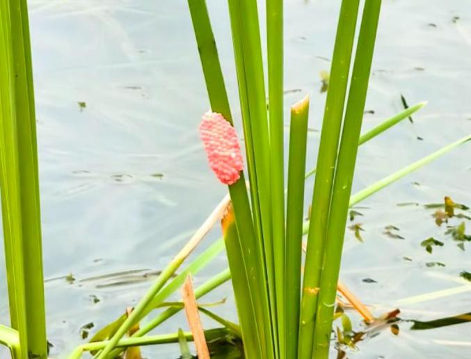 产在水生植物上的福寿螺卵块,为清除卵块,旁边已有茎叶被截除。长江日报记者明眺生 摄
