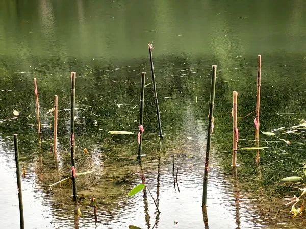 解放公园湖中插着的竹竿上附着有福寿螺卵块。长江日报记者明眺生 摄