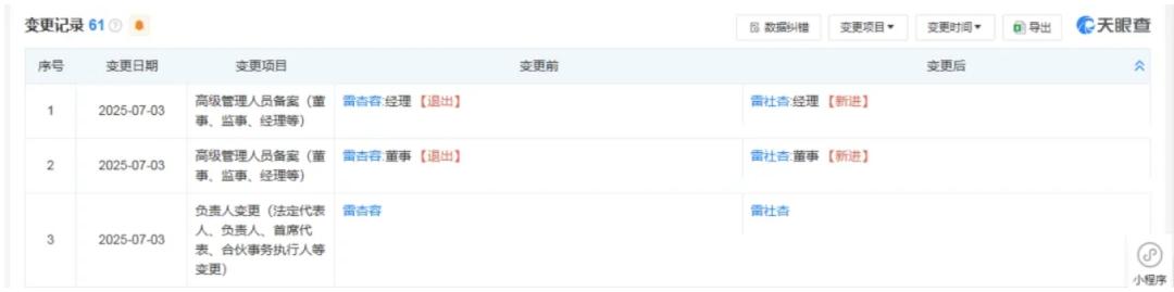 此外,据天眼查APP显示,深圳罗马仕科技有限公司近日发生工商变更,雷杏容卸任法定代表人、董事、经理,由雷社杏接任。该公司成立于2012年3月,注册资本600万元。
