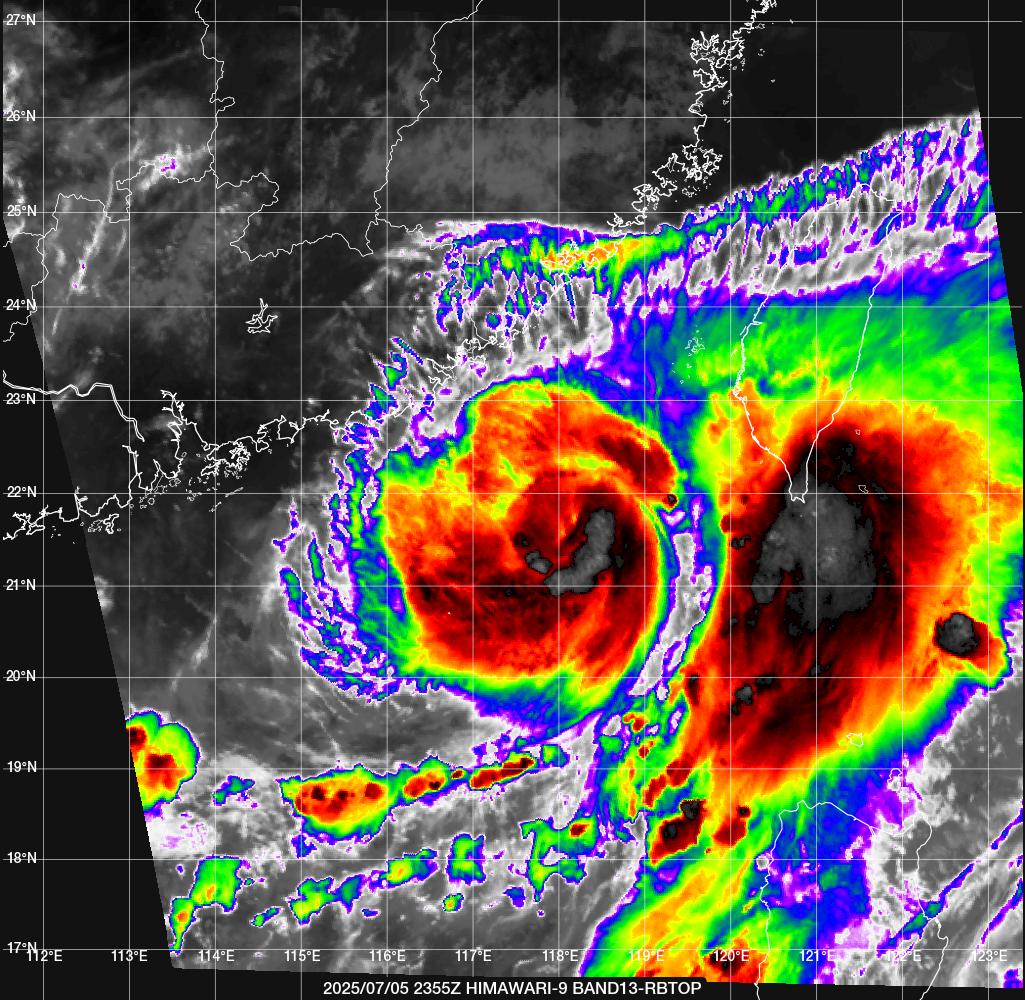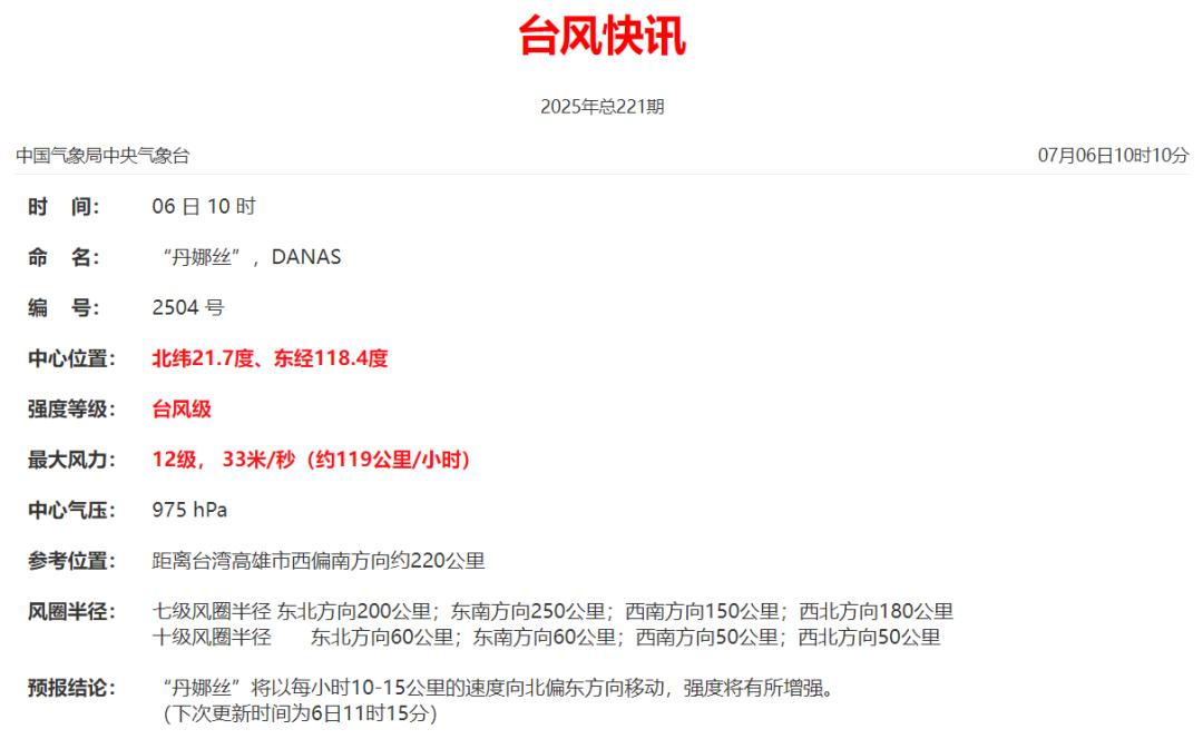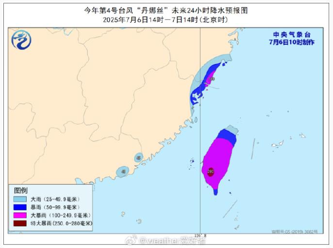 7月6日14时至7日14时,广东东部、福建东北部、浙江东南部、台湾岛等地部分地区有大到暴雨,其中,浙江南部沿海、台湾岛中南部等地部分地区有大暴雨,台湾岛南部局地特大暴雨(250~280毫米)。