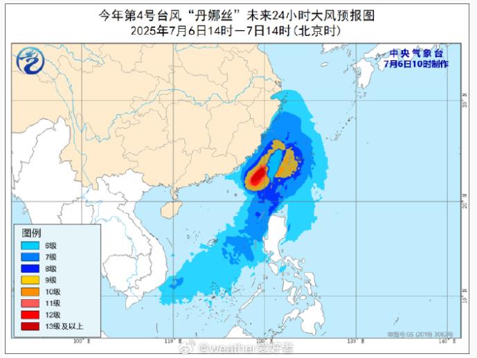 其中南海东北部、东海西南部的部分海域、台湾海峡、台湾以东洋面、巴士海峡西部、台湾岛沿海的风力有9~11级,阵风12~13级,“丹娜丝”中心经过的附近海域或地区风力可达12~14级、阵风15级。