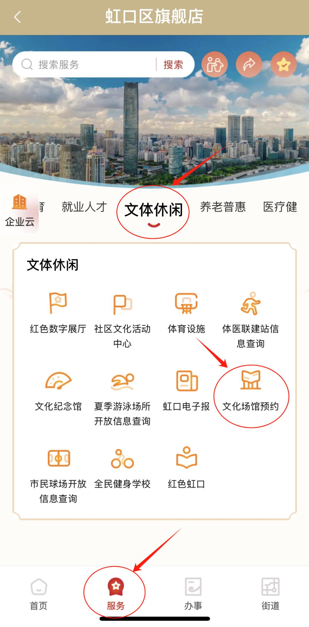 在“服务”页面“文体休闲”板块
