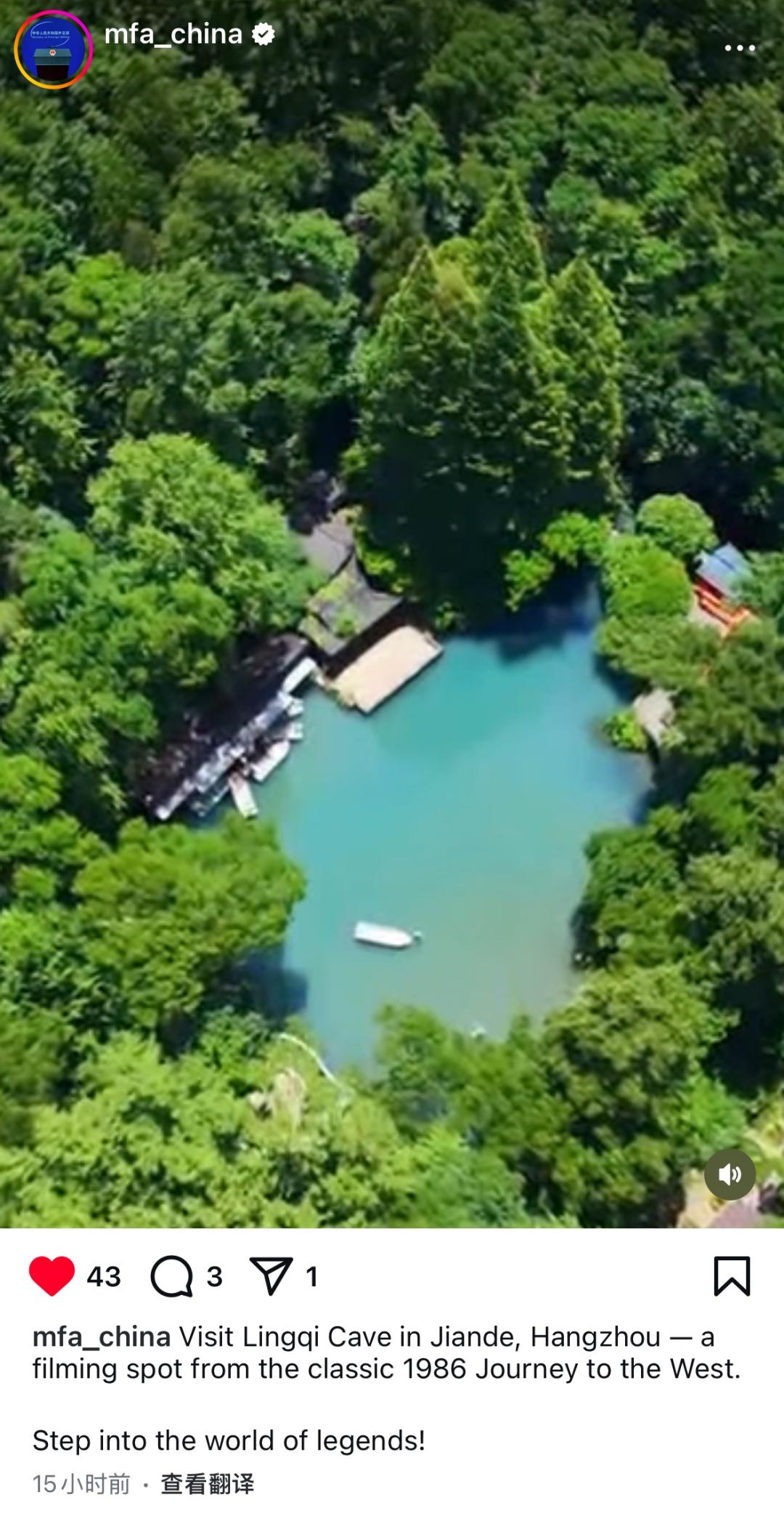 7月3日,中国外交部发言人海外官方Instagram账号发布了一条视频推文推荐灵栖洞景区:“畅游杭州建德灵栖洞——86版《西游记》经典取景地,踏入神话世界!”