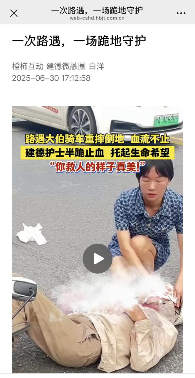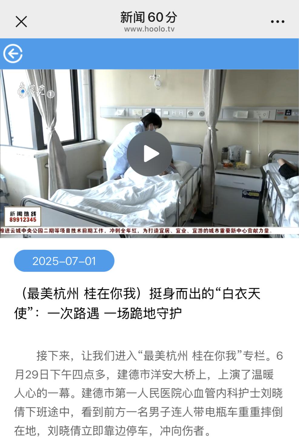 6月30日-7月2日,中国蓝新闻客户端、《新闻60分》、《杭州日报》、橙柿互动客户端等报道了市一医院护士刘晓倩下班途中,看到老人骑车重重摔倒在地,立即下车冲向伤者为其施救的暖心行为。