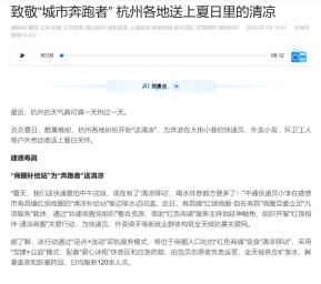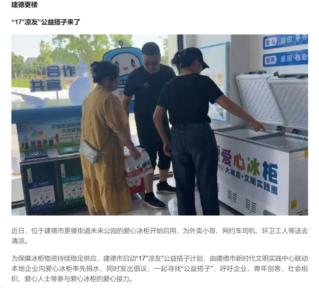 7月4日,《浙江日报》、潮新闻客户端、浙里杭州公众号报道寿昌镇整合“红色商铺”等资源,通过“定点驿站+流动服务”双轨模式,为快递员、外卖骑手等新就业群体提供全天候饮水、休息和防暑物资,构筑清凉关爱网;更楼街道联合新时代文明实践中心启动“17°凉友”公益搭子计划,在公园设置爱心冰柜及休息区,并号召社会力量接力捐水,为户外工作者送去清凉与关怀。