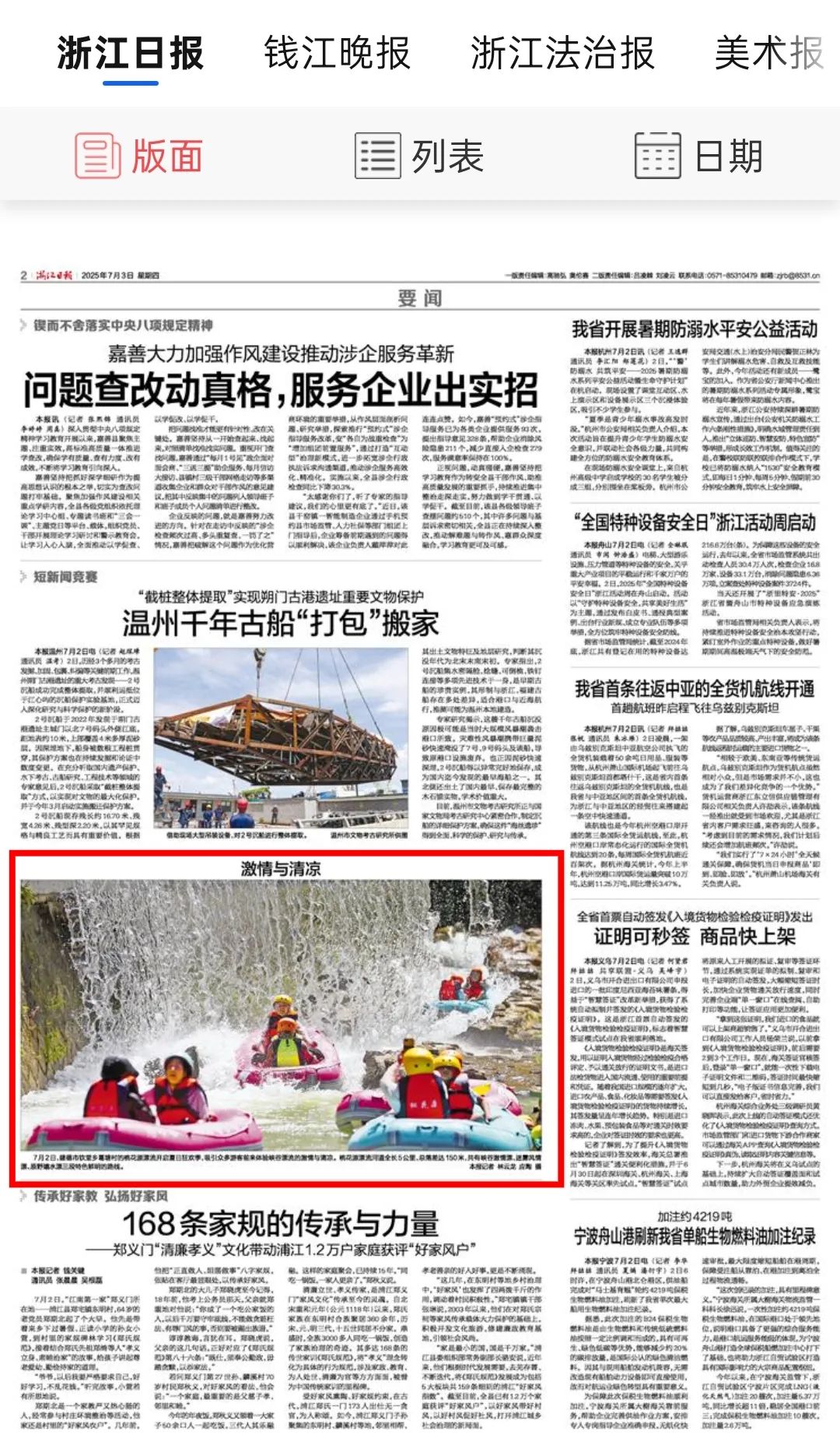 7月3日,《浙江日报》、潮新闻客户端、《杭州日报》报道钦堂乡“桃花源”漂流以清凉刺激的峡谷赛道引爆人气,激活农文旅产业链,带动乡村共富发展。